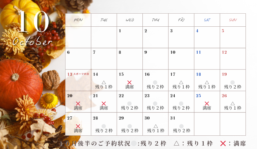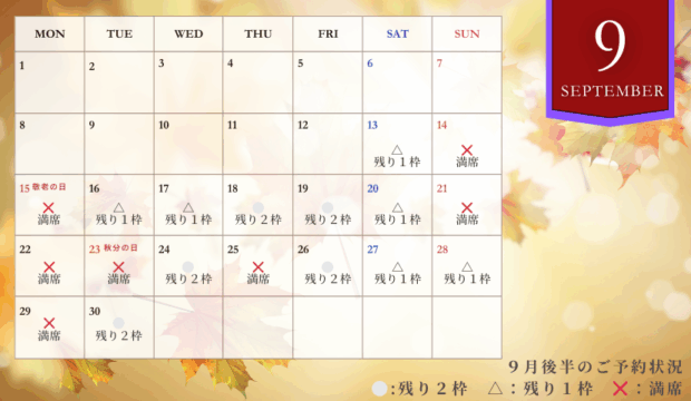 10月以降の空席確認におきましてはWEB予約をご覧ください。